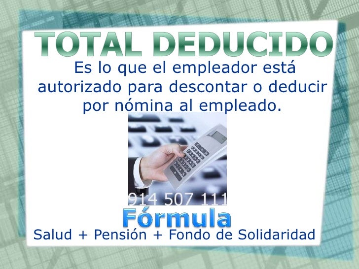 Fondo de solidaridad pensional: Todo trabajador que devengue un sueldo que sea igual o superior a 4 salarios mininos, debe aportar un 1% al Fondo de solidaridad pensional. Al igual que los conceptos anteriores, éste concepto se resta (deduce) del total devengado del trabajador.